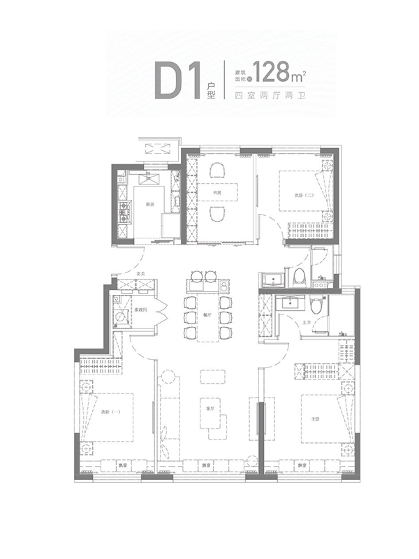 三室朝阳 全明设计,4室2厅2卫,建筑面积约128平米
